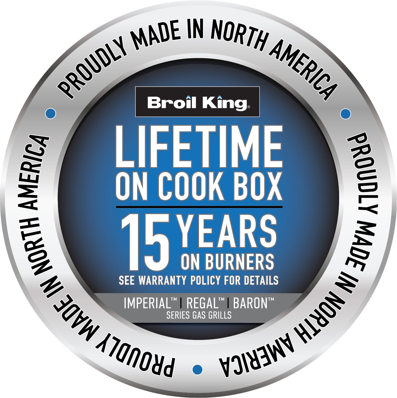 Broil King Regal™ 570 er produsert i Nord-Amerika med høykvalitets rustfritt stål, noe som sikrer langvarig ytelse. Alle ståldeler er nøye galvanisert og behandlet med porselensemalje eller pulverlakk i en avansert trestegsprosess, noe som gir overlegen rustbeskyttelse og holder grillen i topp stand i mange år.
