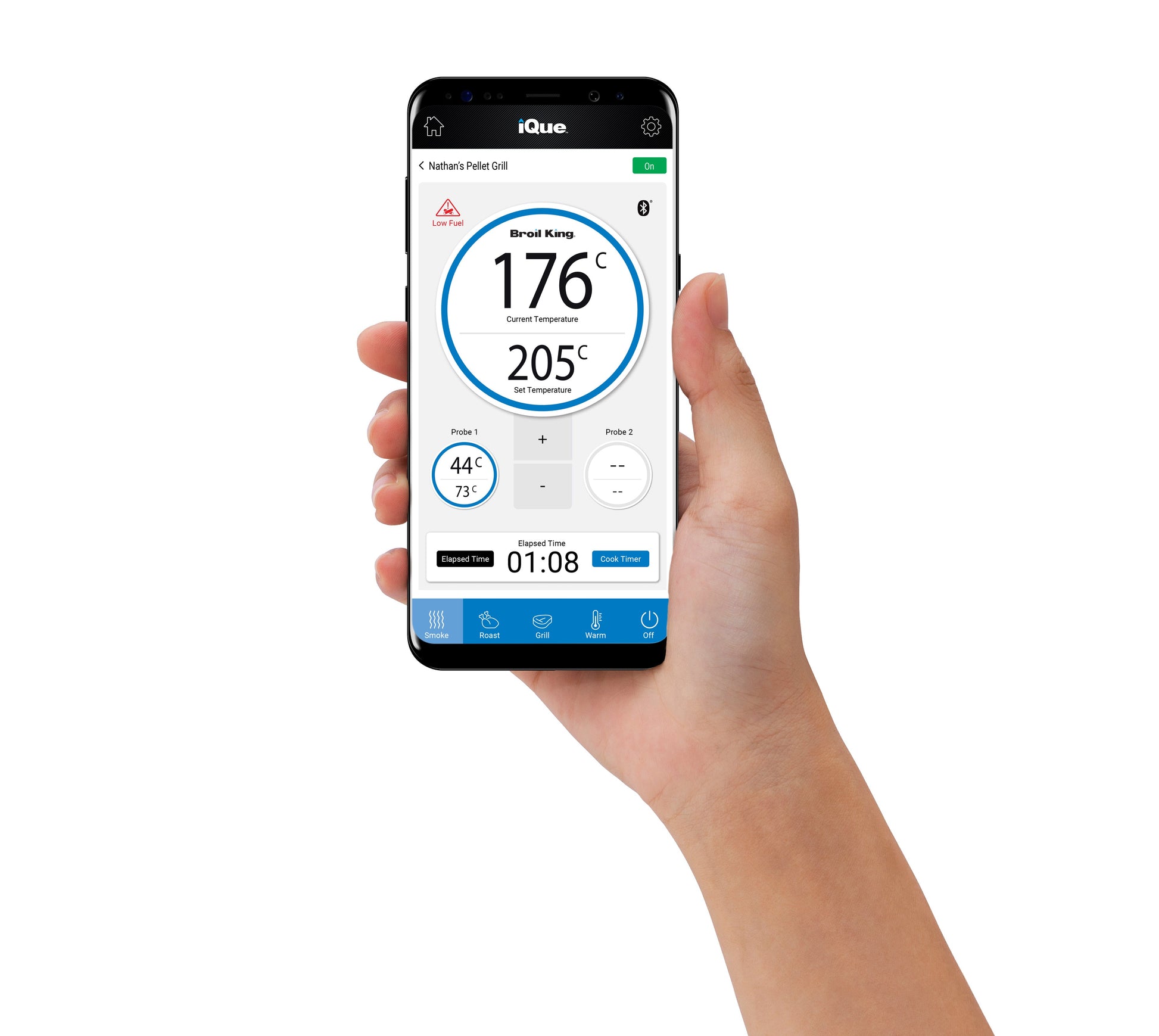 Regal™ Pellet 500 PRO gir deg enkel kontroll via en digital kontrollpanel eller fjernstyring gjennom Broil King®-appen over WiFi/Bluetooth®. Juster innstillinger eller overvåk grillen uansett hvor du befinner deg.